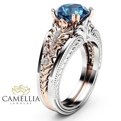 Blue Diamond Engagement Ring Unique Vintage Diamonds Ring 14k 2 Tone Gold Ring